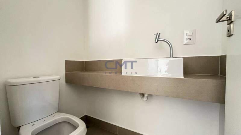 Lavabo com piso e rodapé em porcelanato, parede em gesso projetado e cuba de apoio retangular com mesa