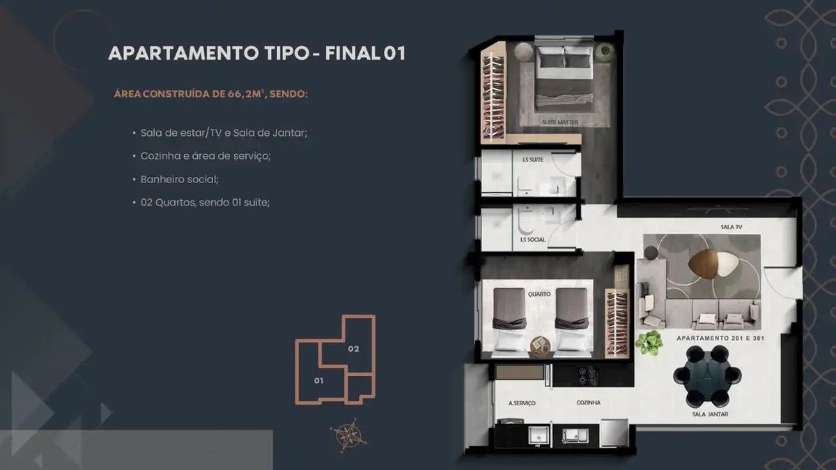 Apartamento com 66m² contando com dois quartos sendo uma suíte, banheiro social, sala de estar e jantar, cozinha, área de serviço e duas vagas de garagem.