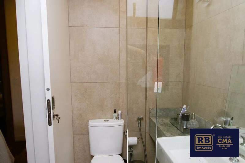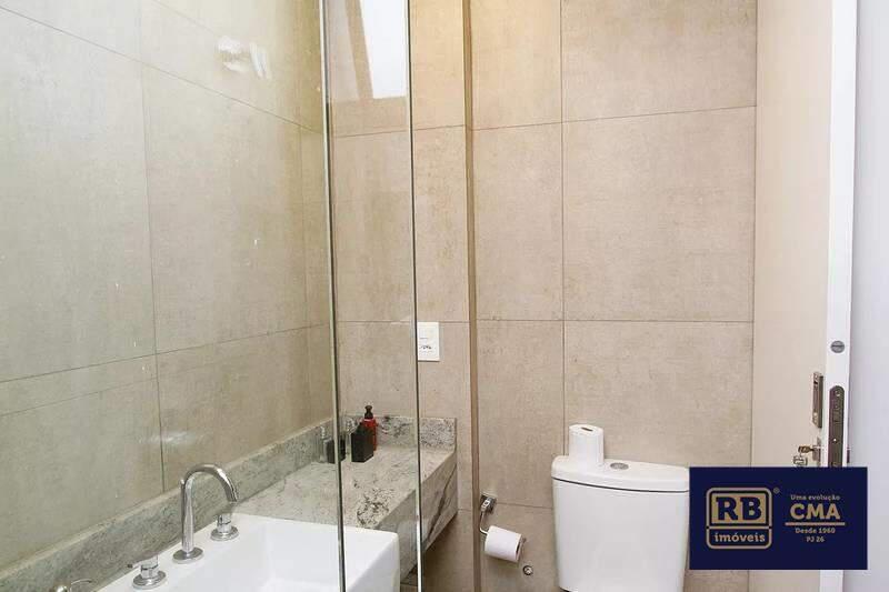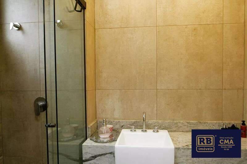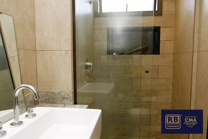 Banheiros das suítes com piso em porcelanato, bancadas em granito e box em vidro temperado.