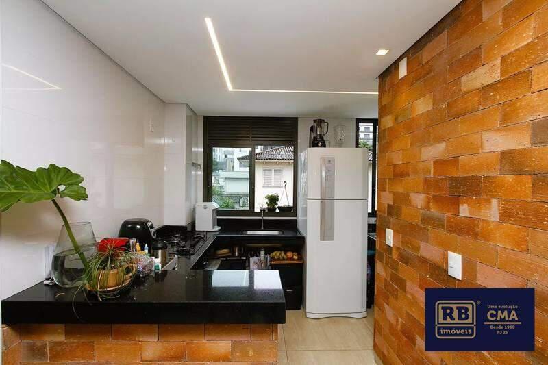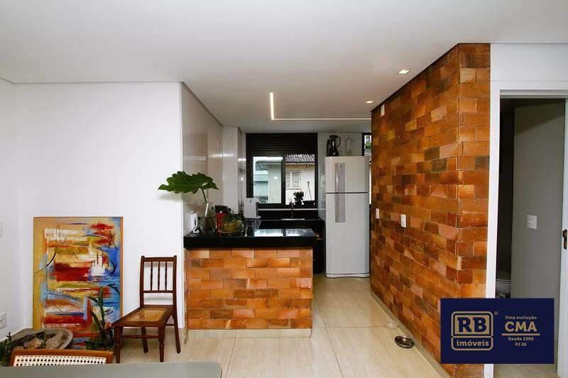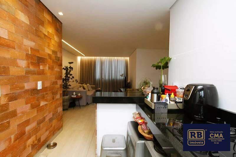 Cozinha em conceito aberto, com piso em porcelanato e bancada em granito.
