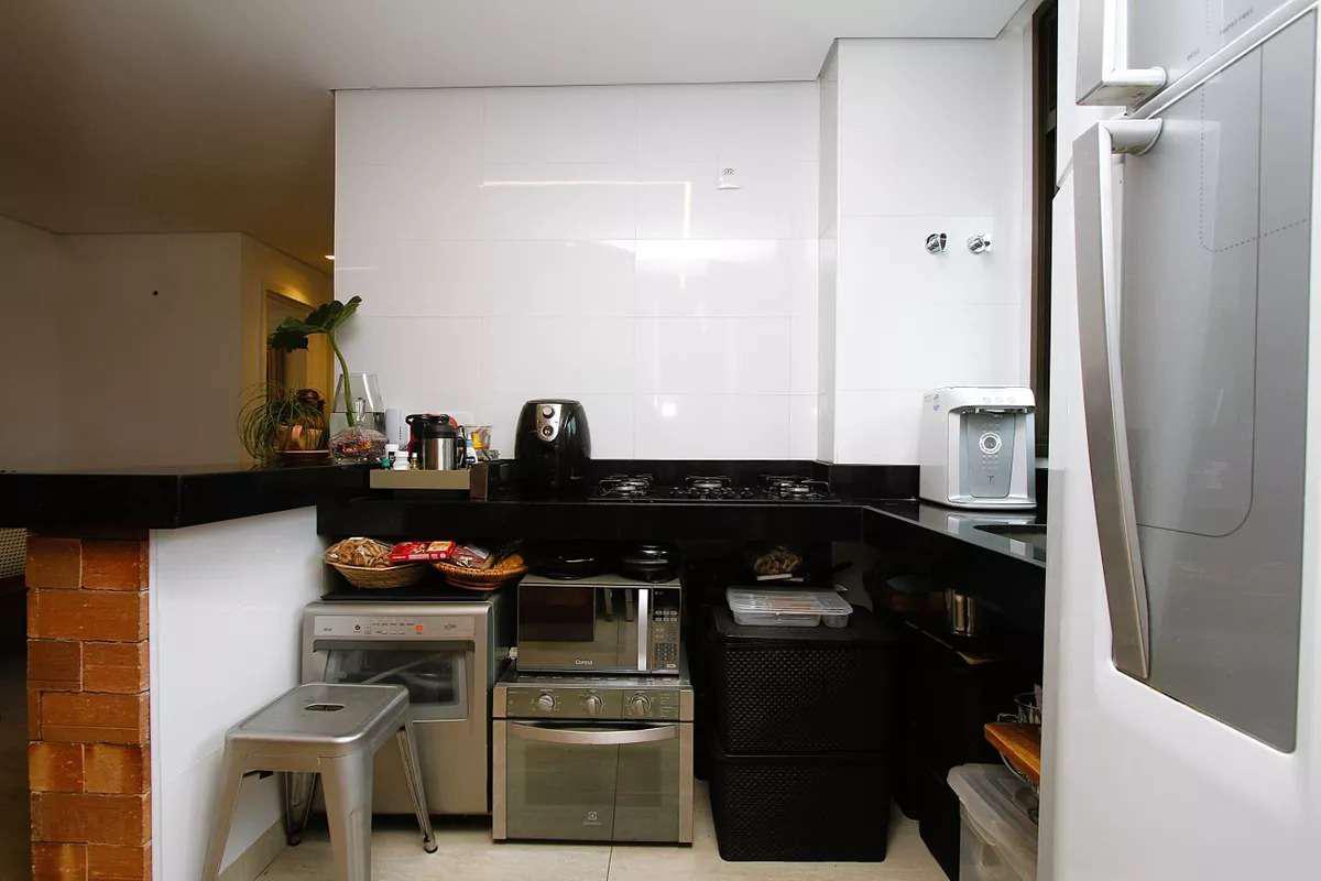 Cozinha em conceito aberto, com piso em porcelanato e bancada em granito.