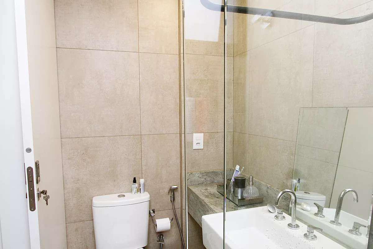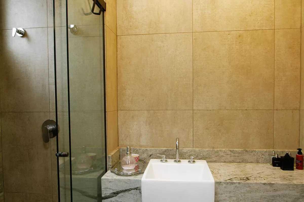 Banheiros das suítes com piso em porcelanato, bancadas em granito e box em vidro temperado.