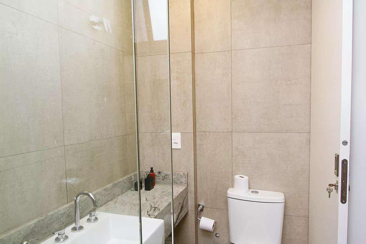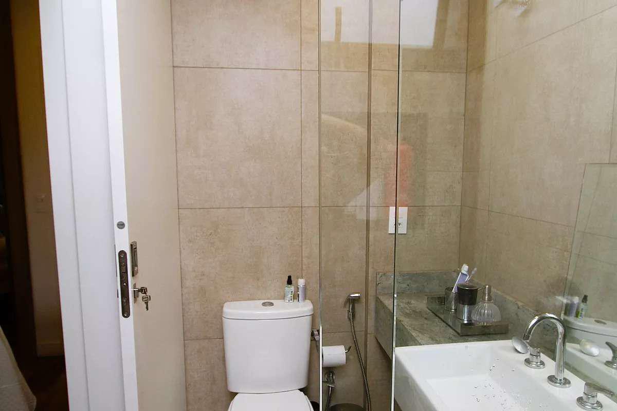 Banheiros das suítes com piso em porcelanato, bancadas em granito e box em vidro temperado.