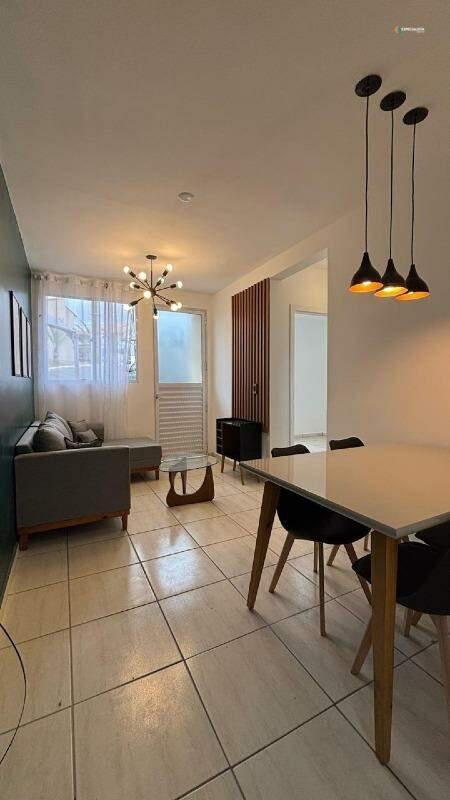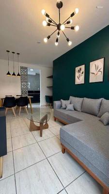 Sala para dois ambientes, já mobiliada com sofá, mesa de 4 cadeiras, mesa de centro, lustres e toda reformada