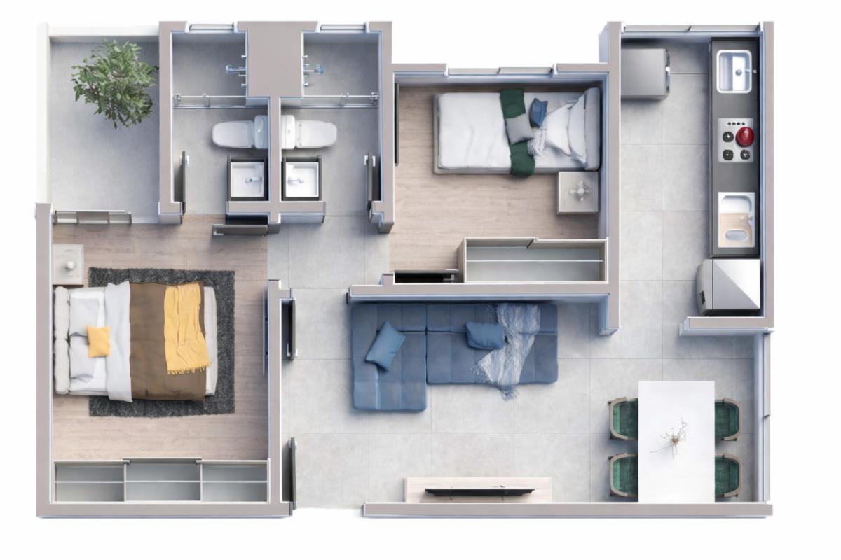 Sala dois ambientes e com piso em porcelanato. Cozinha e área de serviço com piso em porcelanato, bancada em granito, revestimento em cerâmica retificada, pia e tanque com inox embutido. Dormitórios com piso laminado, parede com pintura e Janelas de correr veneziana. Banheiros com piso em porcelanato, revestimento em cerâmica retificada, pia com bancada em granito, com Cuba de apoio em louça.