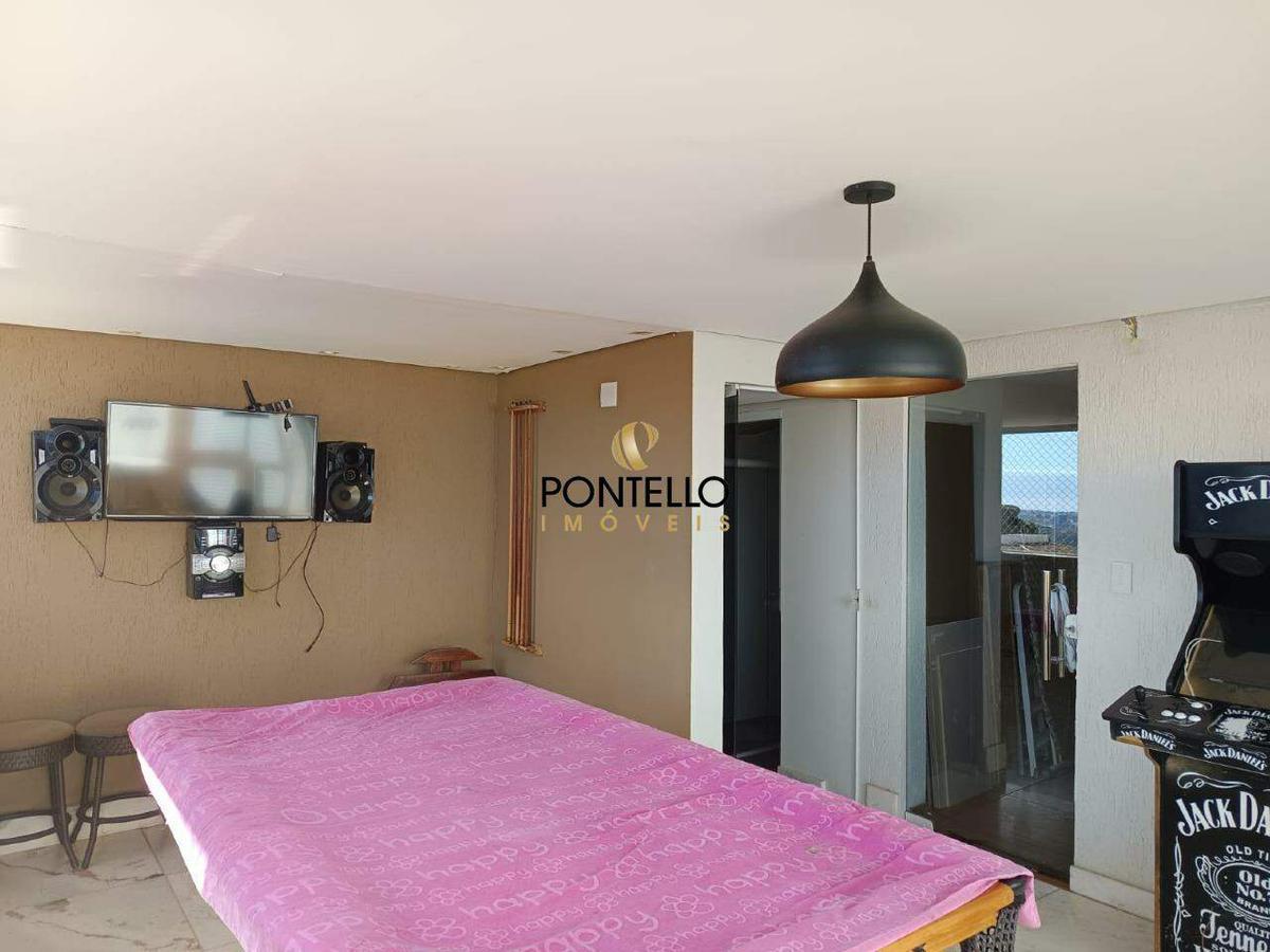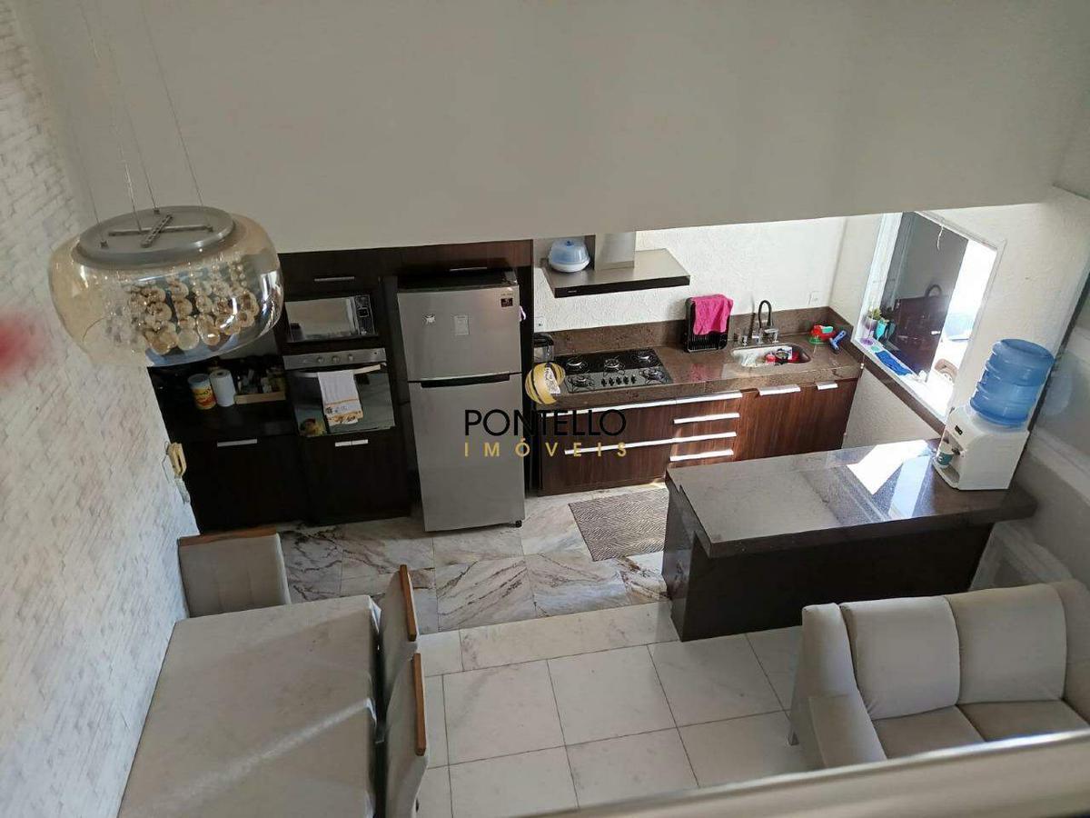 Excelente apartamento duplex, mobiliado, com 2 quartos, sendo uma suíte, banheiro social, sala conjugada com cozinha, lavanderia, despensa, área gourmet com cozinha, churrasqueira, jacuzzi, lavabo, e uma linda vista. Duas vagas de garagem. Armários planejados em todos os cômodos, próximo a vários pontos comerciais.