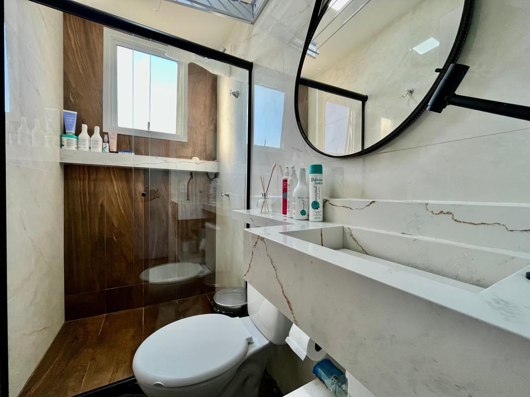 -Banheiro social com bancada em quartzo branco rajado, box e nicho