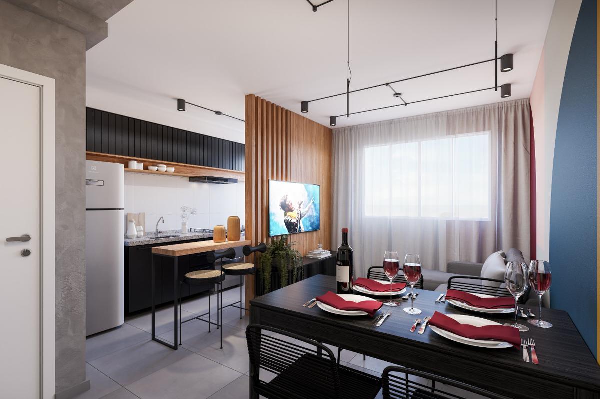 Piscina com deck e prainha, sky bar, academia, coworking, salão de festas, espaço gourmet, sauna, espaço kids, minimercado e lavanderia conjugados.