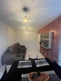Apartamento com área interna de 45 m², 02 quartos, sala, banho social e cozinha americana. Pisos cerâmica, banheiro com armário sob pia e box blindex em vidro blindex, área de serviço separa por porta de vidro..