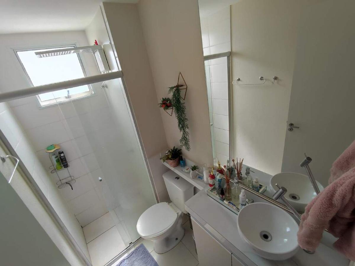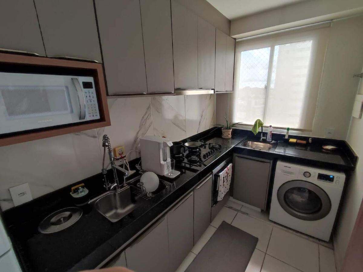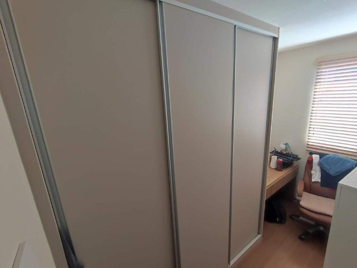 O apartamento possui sala, 2 quartos, banheiro com box, pia em granito e armário. Armários na cozinha e área de serviço, bancada americana, armários no banheiro e quarto, contém uma vaga de garagem demarcada e coberta.