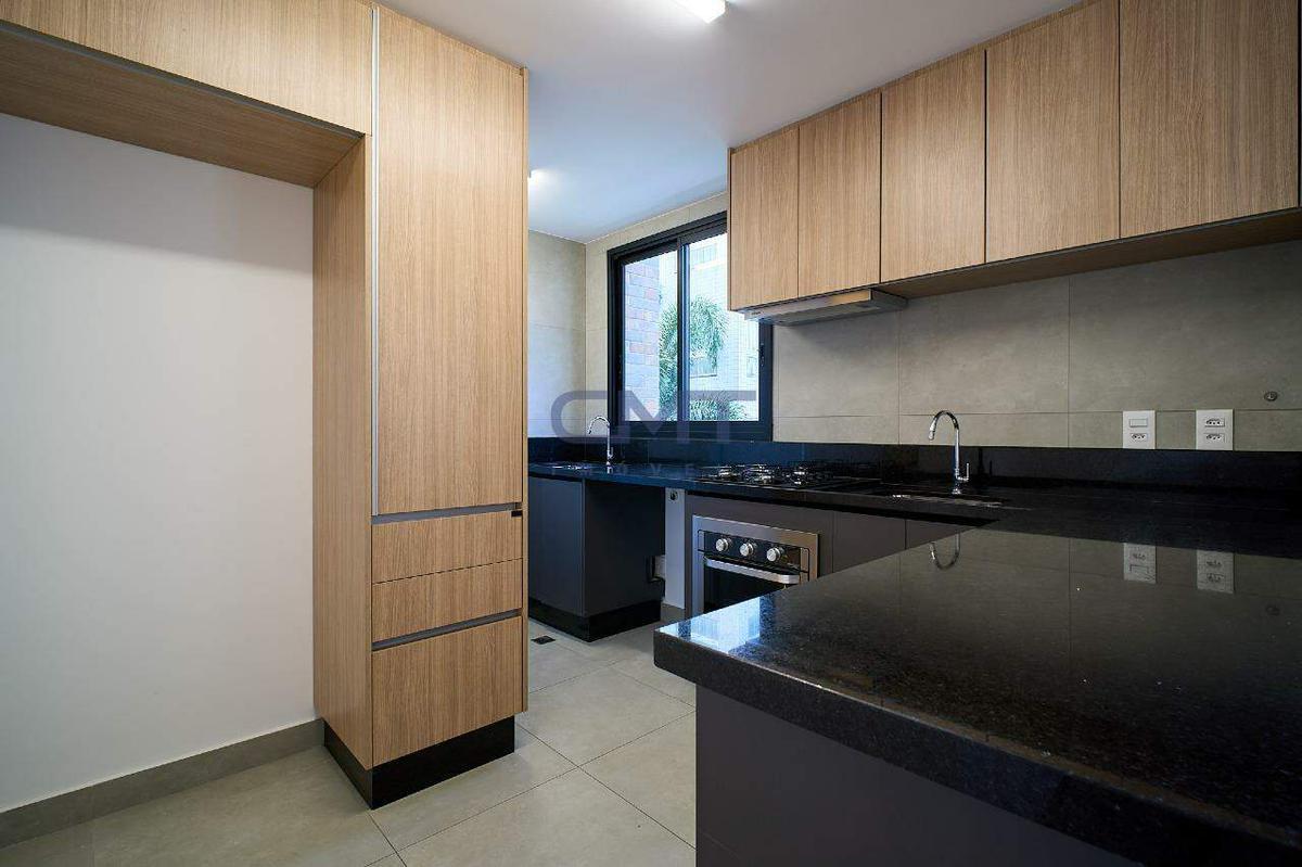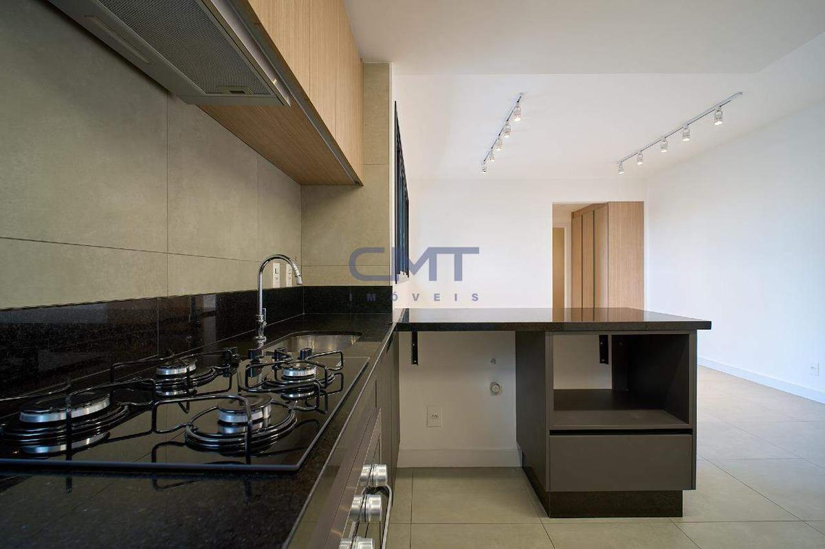 Cozinha americana com bancadas em granito, armários planejados e cooktop.
