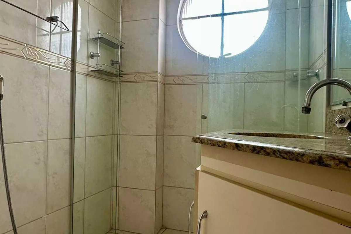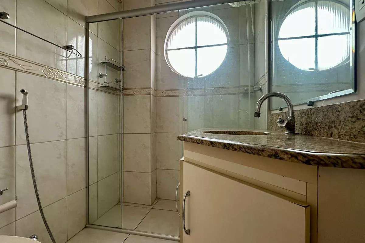 Banheiro social com bancada em granito, espelho e box em blindex
