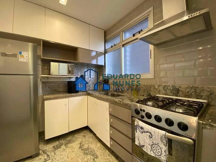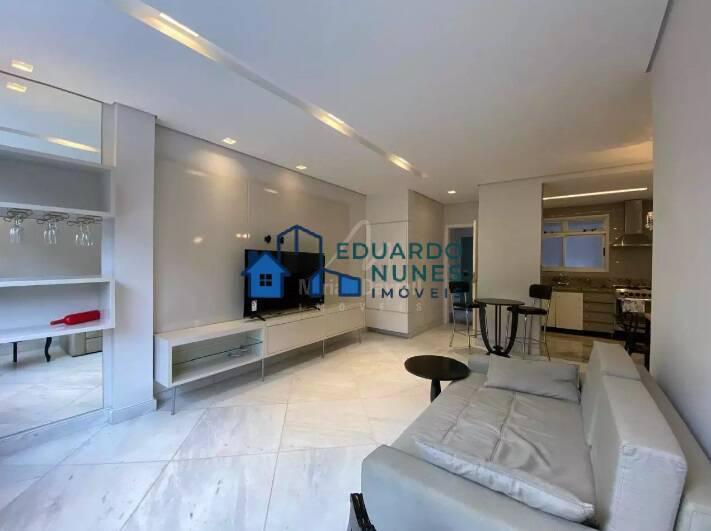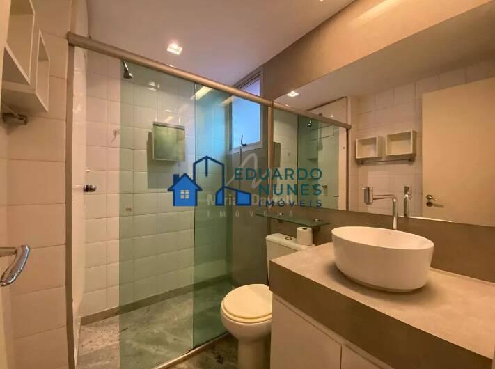 Apartamento com 82 m²; sala com piso em mármore, teto em gesso e iluminação planejada; 2 quartos com armários, sendo 1 suíte, janelas de alumínio com venezianas, piso em mármore; banhos com box, armários e espelhos; cozinha com armários e área de serviço;