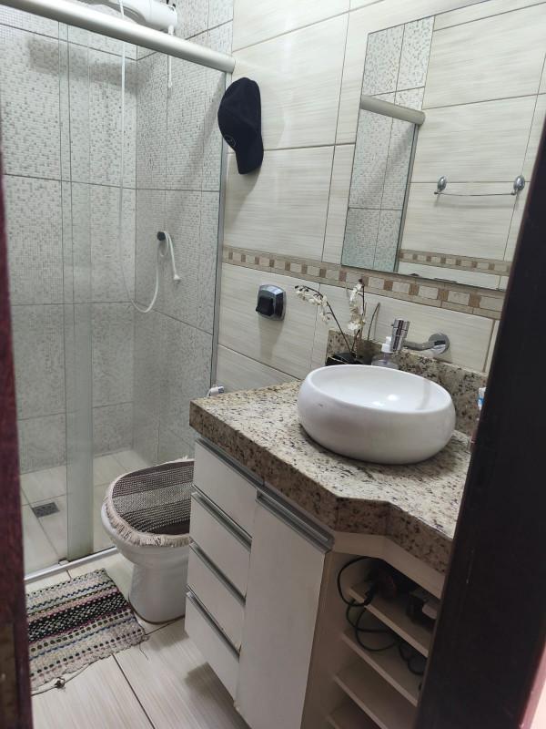 Banheiro com armário, granito, pia em cuba, moisaco.