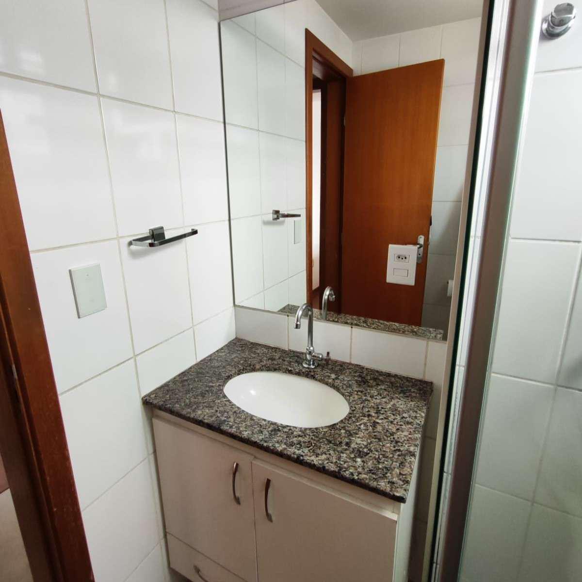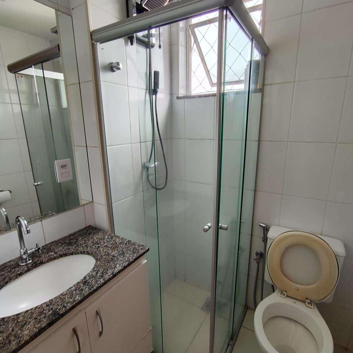 Banheiro social com acabamento em porcelanato, armário, espelho e box em Blindex.