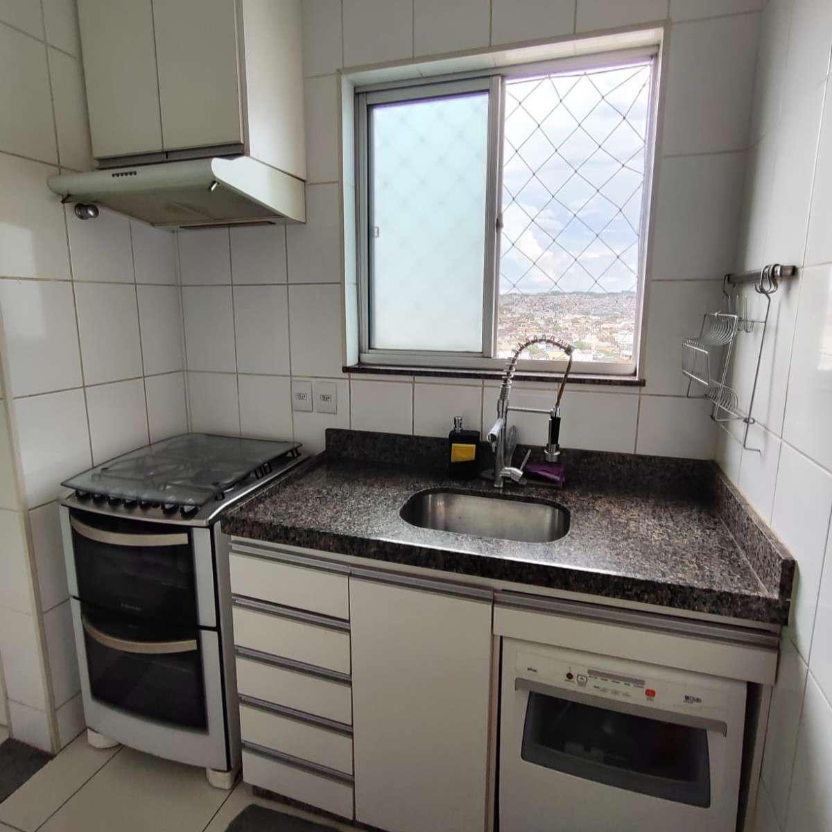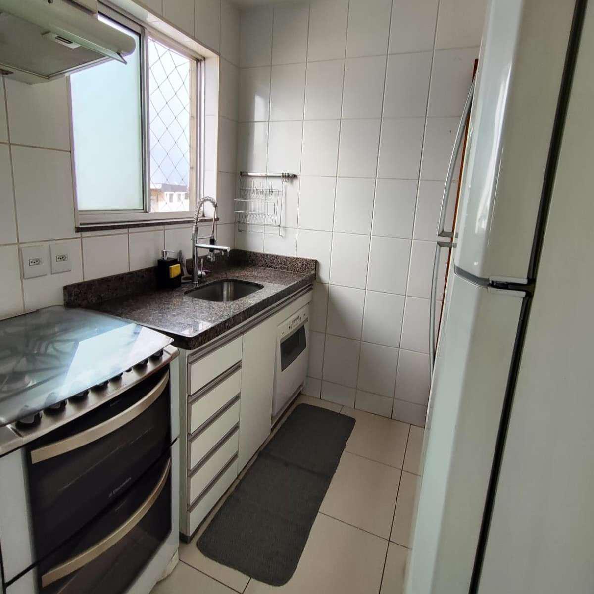 Cozinha equipada com armários planejados, bancada em granito e piso em porcelanato, oferecendo funcionalidade e durabilidade.