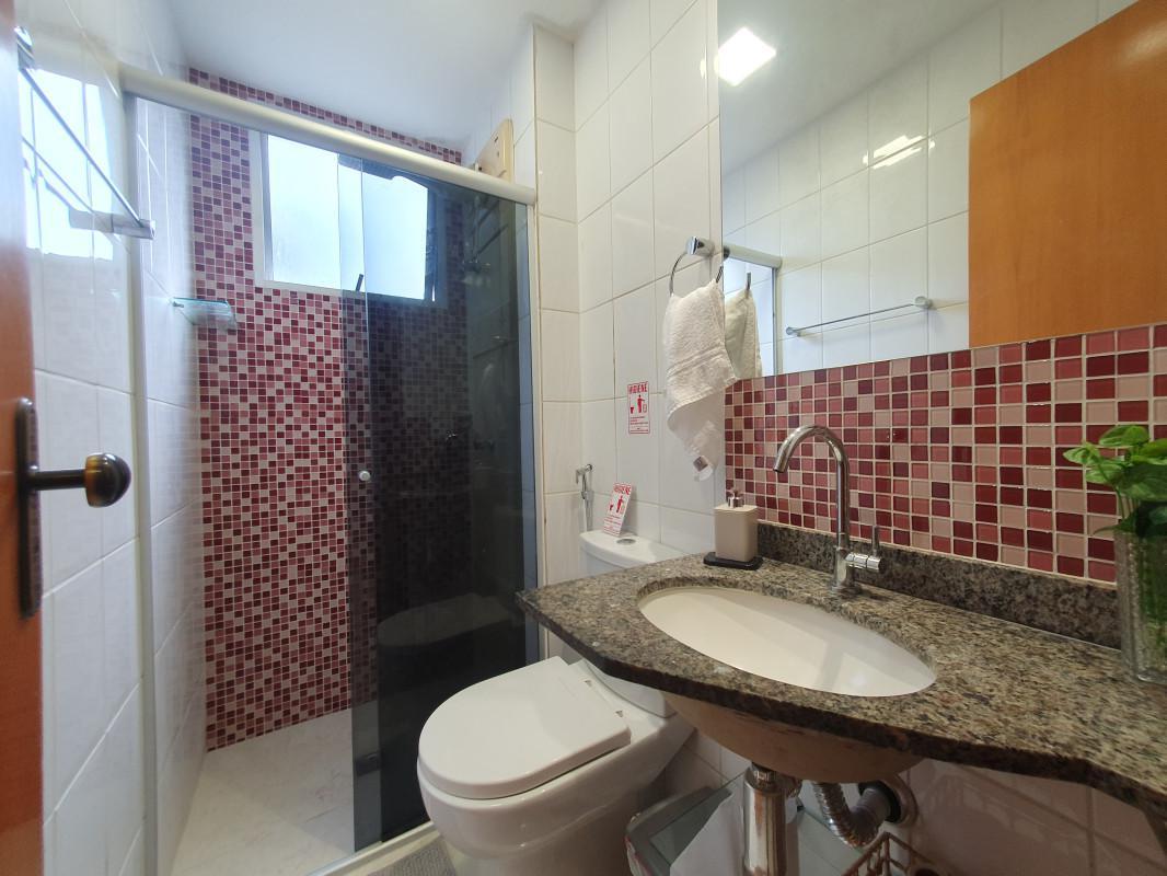 Banho social com box em blindex, bancada em granito e armários;