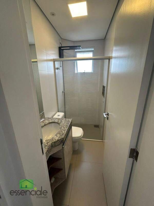 Na suíte e banho social com bancada em granito, box em vidro temperado, chuveiro e espelho.