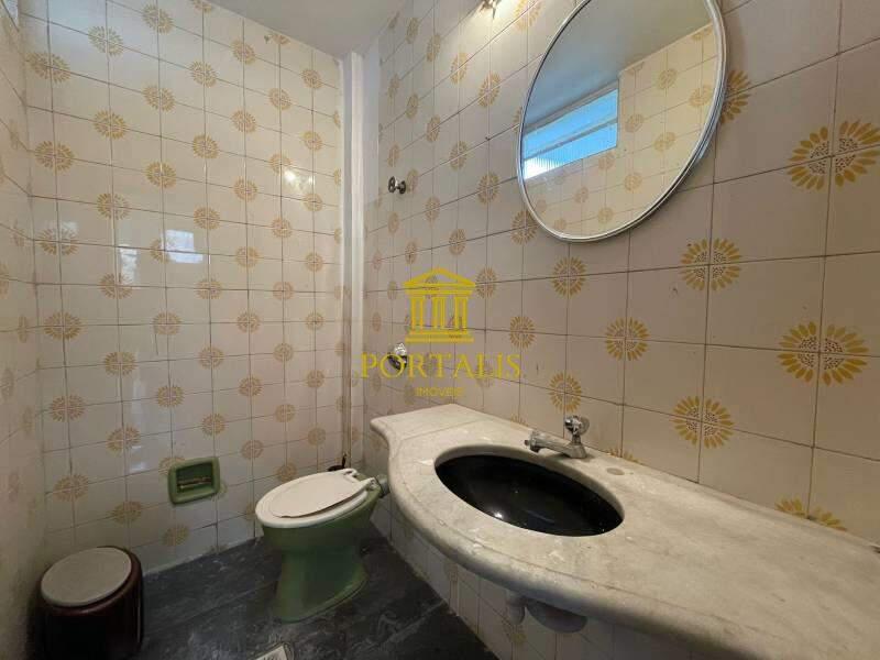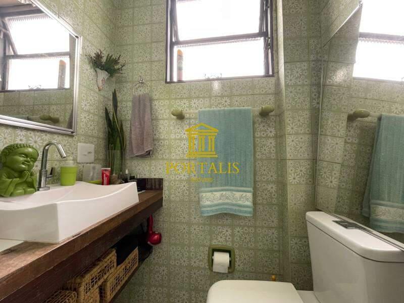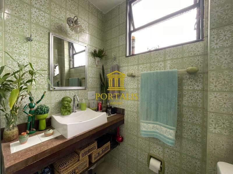 * Banheiro social com bancada, box blindex e piso em porcelanato,