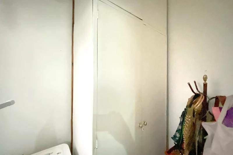 Área de serviço independente com armário e banheiro de apoio.
