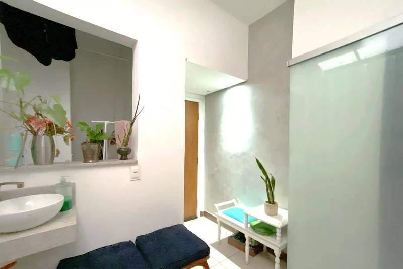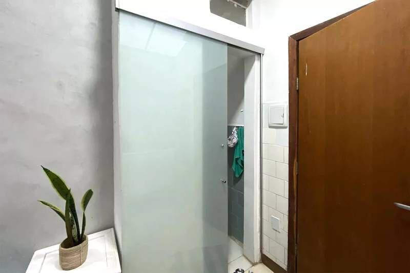 Banheiro social com armário, box em blindex e piso em cerâmica.