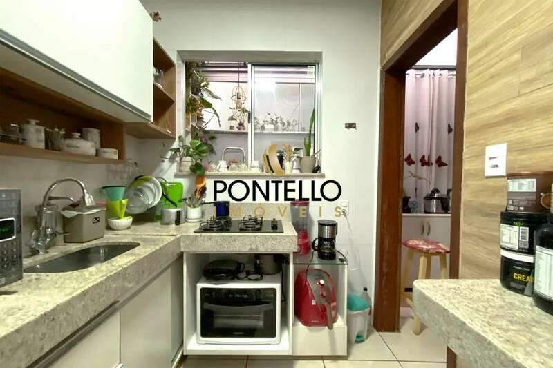 Cozinha funcional com armários, bancada em granito, piso em cerâmica.