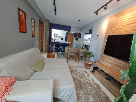 Apartamento claro, arejado, andar alto, vista definitiva, área de 72m², sala para 02 ambientes c projeto luminotécnico, 02 quartos com armários, sendo 01 suíte, banho social e suite com bancada em granito, armários, espelhos e box em blindex, cozinha americana com armários planejados, bancada em granito e área de serviço. Piso nas partes sociais e íntimas em porcelanato e das partes frias em granito, esquadrias em alumínio e janelas venezianas nos quartos. Absolutamente pronto p morar, "praticamente de porteira fechada"!