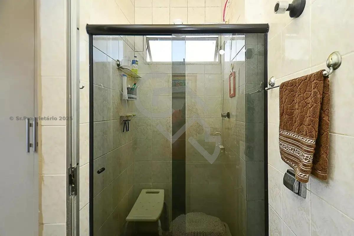 Banho social com armário planejado e box em vidro temperado