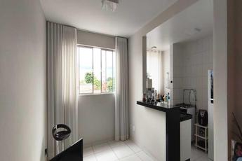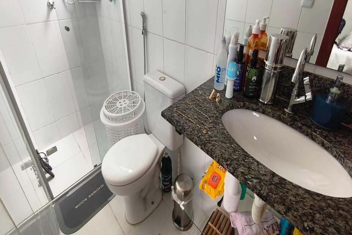 Apartamento com sala em porcelanato, cozinha americana com balcão para a sala, bancada em granito, armários no fechamento da bancada da pia, area de serviço, corredor com armário, 02 quartos com piso porcelanato, sendo 01 dos quartos com armário, 02 banhos sendi um social e outro suíte, azulejados, com box de vidro, piso cerâmica.
