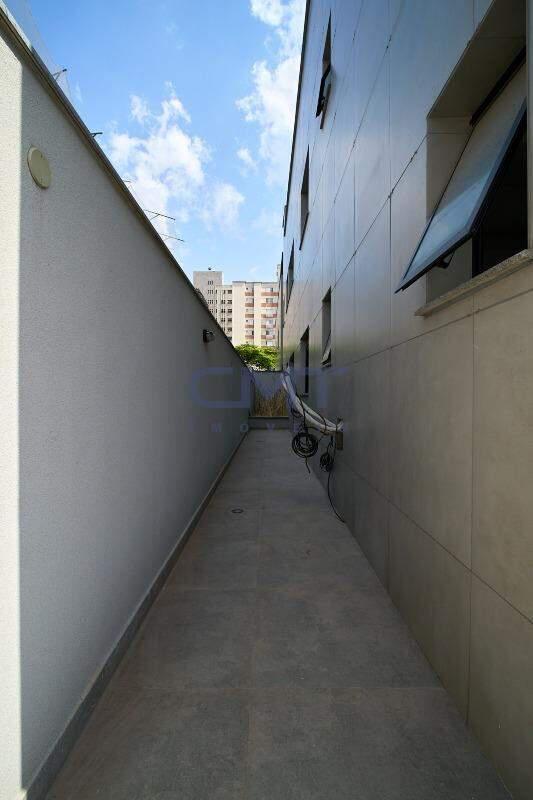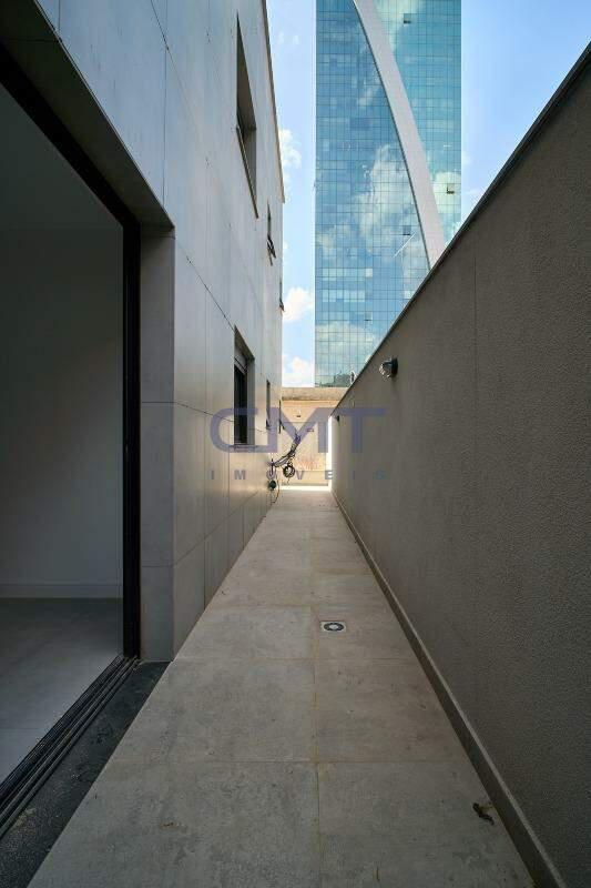 Área externa circundando o apartamento, com jardim ao fundo.