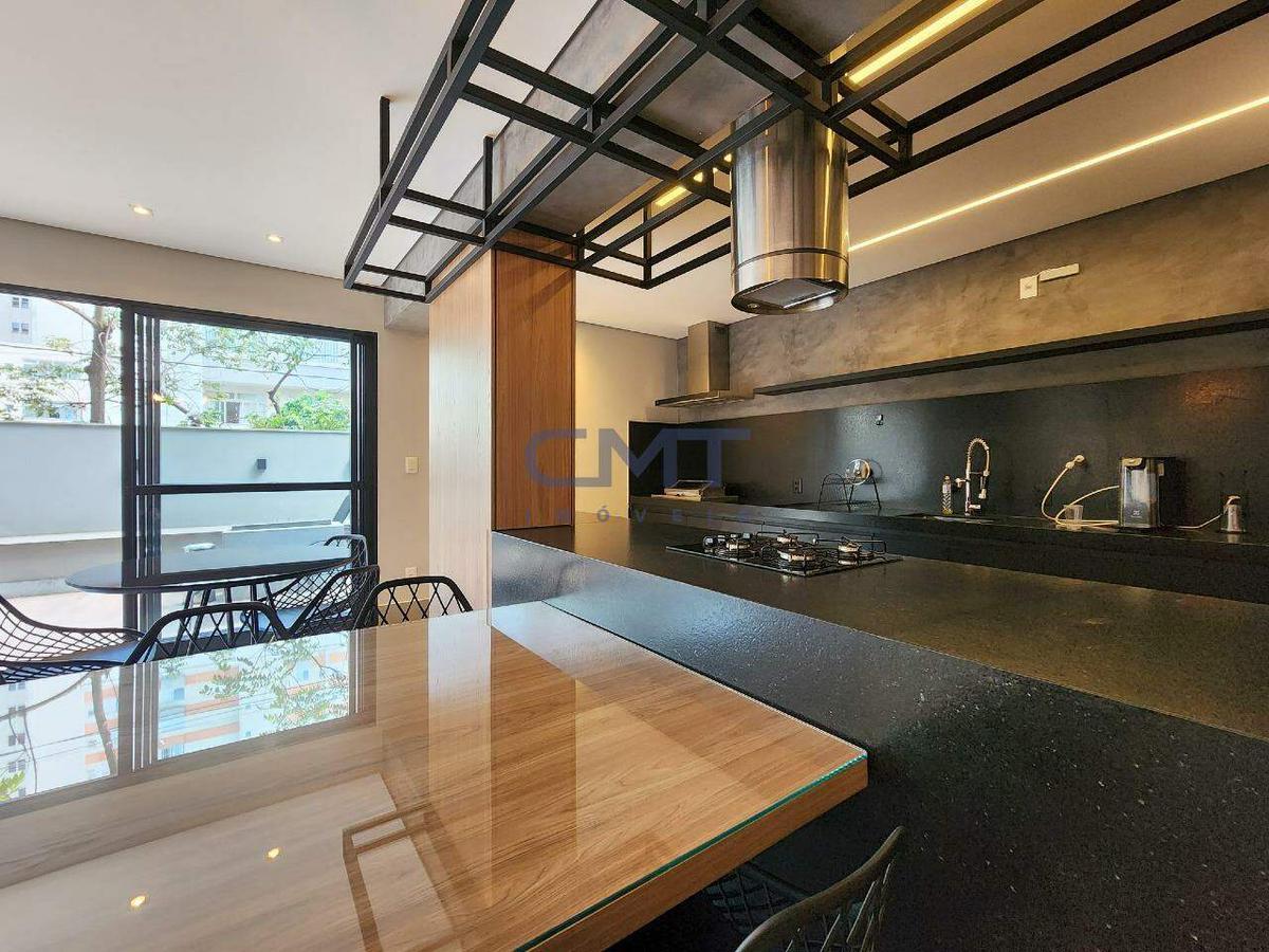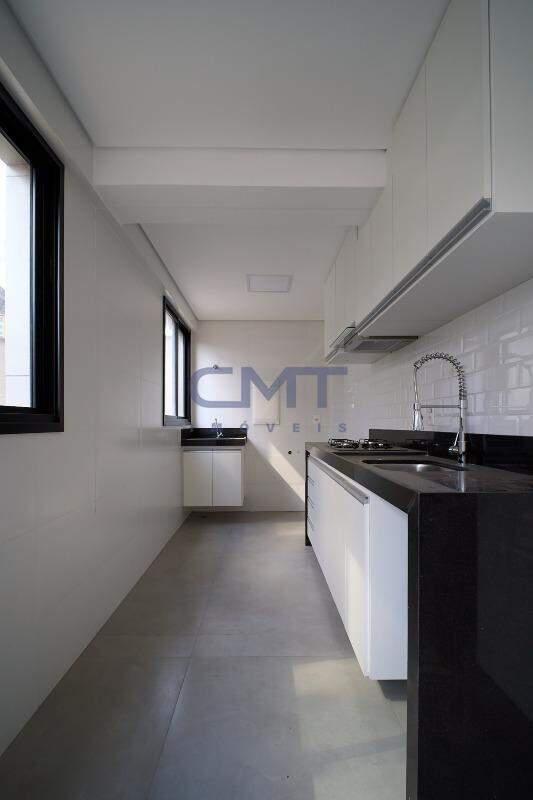 Cozinha americana com piso em porcelanato e bancadas em granito e armários planejados.