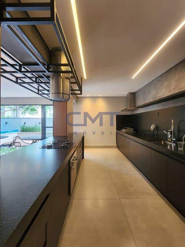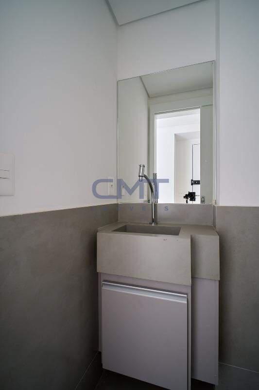 Sala para dois ambientes com rebaixamento de teto, iluminação planejada, piso em porcelanato, amplo acesso à área externa em vidro em esquadria de alumínio, proporcionando melhor ventilação e luminosidade natural no interior do ambiente. Ambiente conta também com lavabo com piso em porcelanato, pia com cuba esculpida.