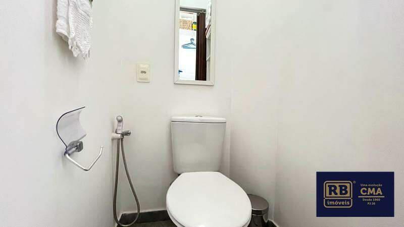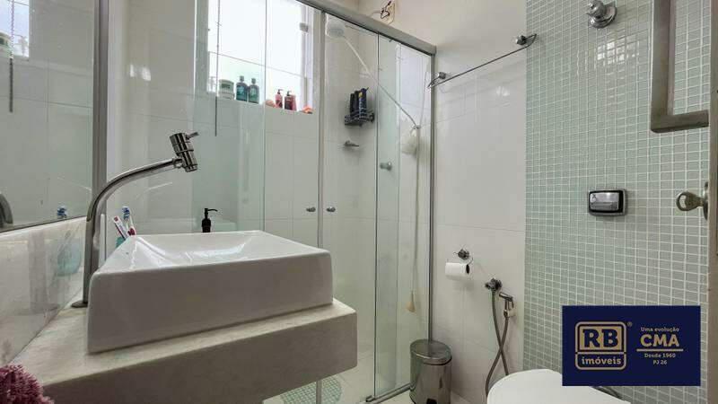 Banheiro social conta com box em blindex, espelho, bancada em granito e pia em cuba