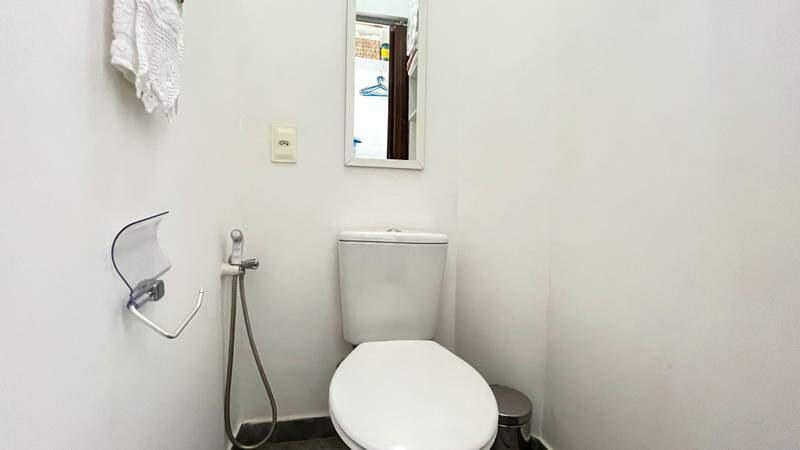 Banheiro social conta com box em blindex, espelho, bancada em granito e pia em cuba
