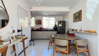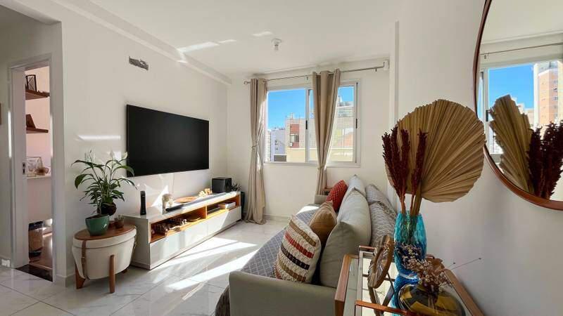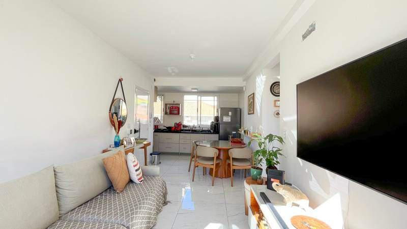 Sala para dois ambientes conjugada com a cozinha, piso em porcelanato
