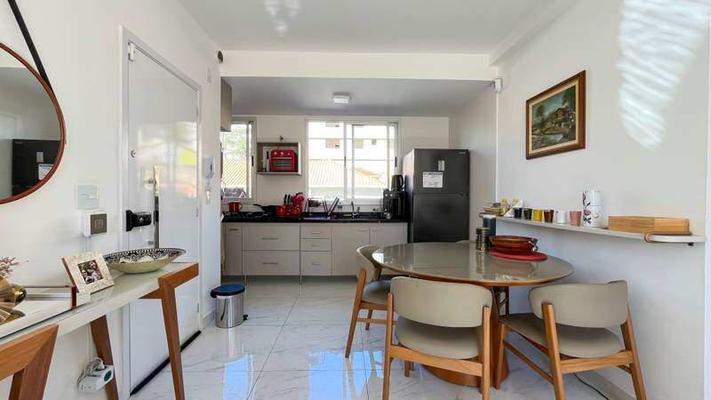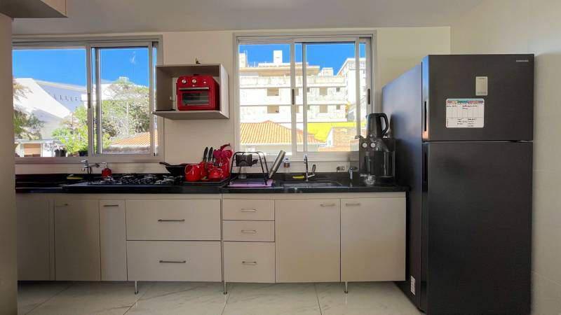 Cozinha com bancada em granito, piso em porcelanato