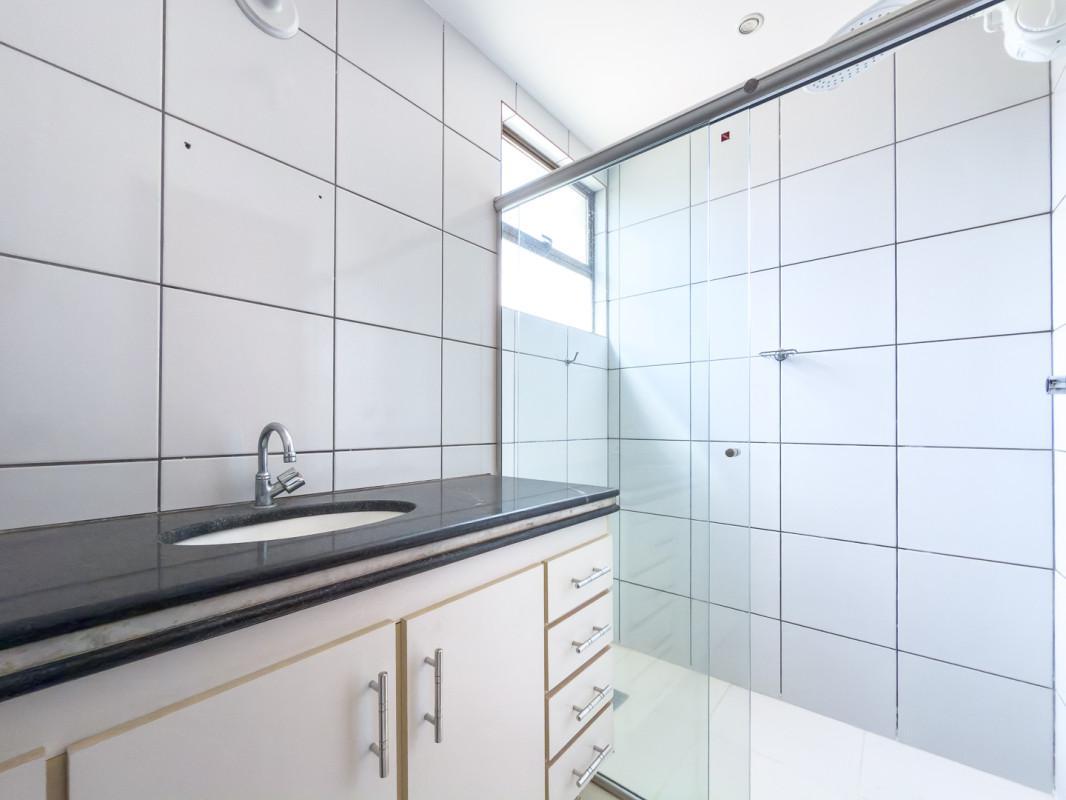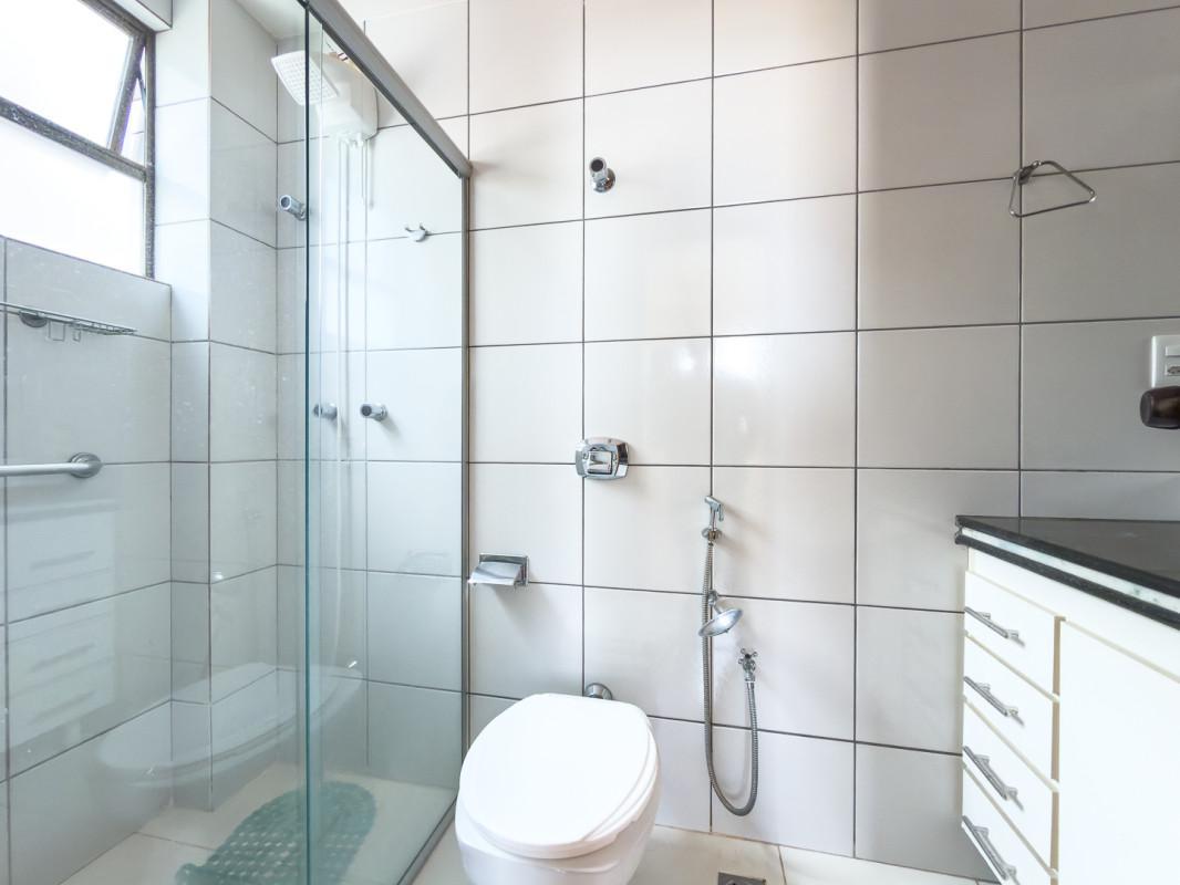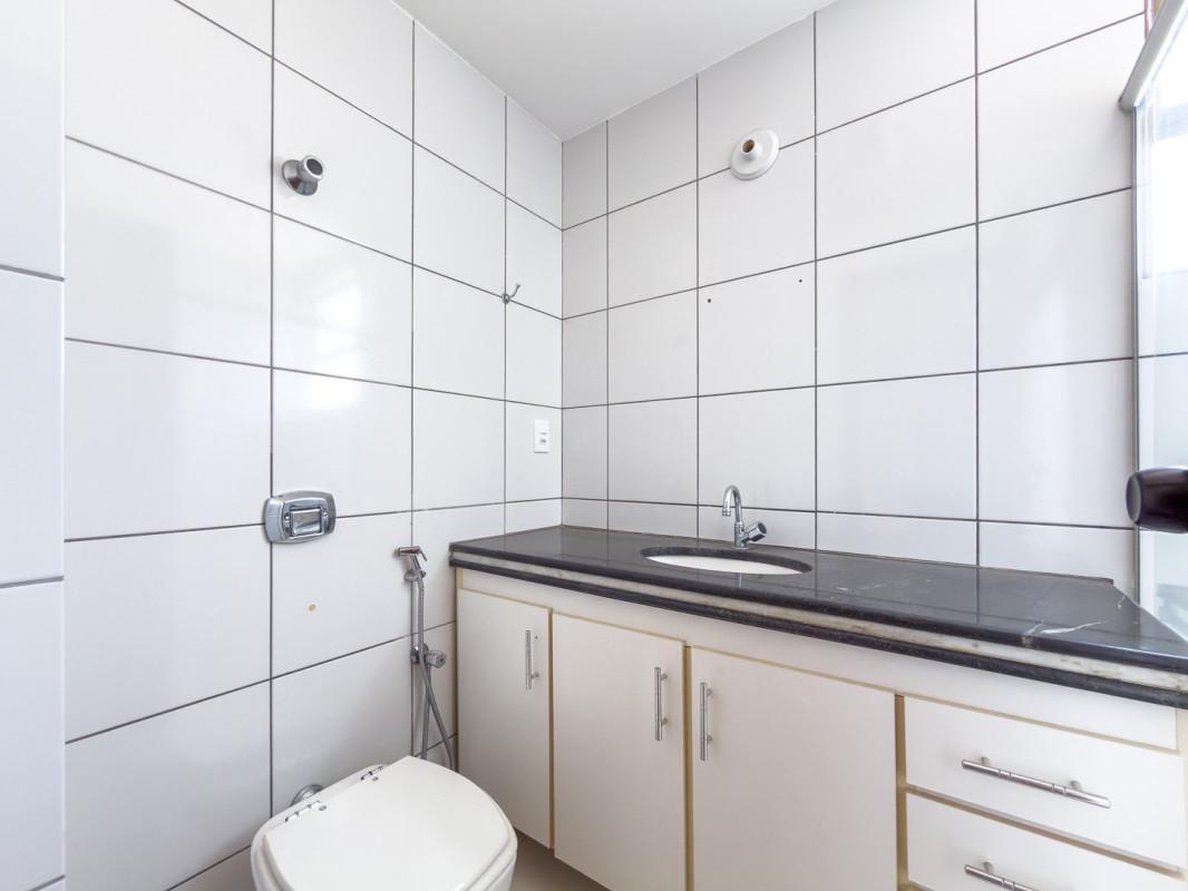 - Banho social com box, armários, piso em porcelanato e bancada em granito;