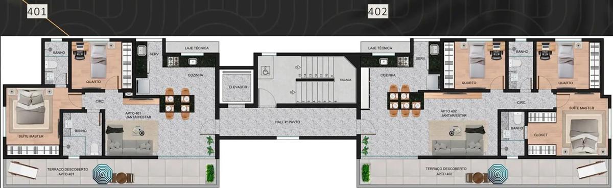 Apartamento com área total de 77m² com área interna de 65m². São dois quartos, sendo uma suíte, um banho social. Sala de jantar e estar no mesmo ambiente, com saída para área privativa com aproximadamente 13m². Cozinha com área de serviço. 2 vagas de garagem.
