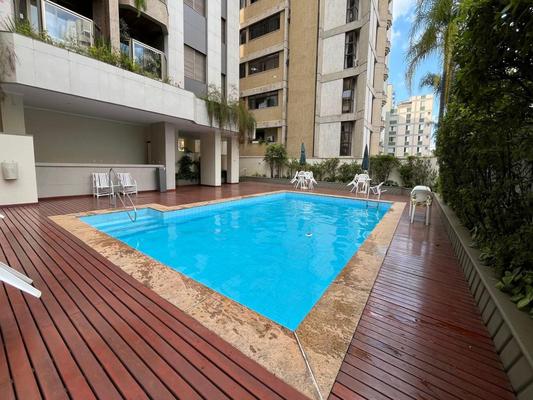 Edificio com fachada totalmente revestida, portaria 24 horas, jardins, hall social decorado, area de lazer com piscina, salao de festas, espaco livre e