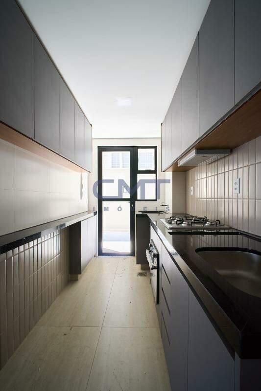 Cozinha com piso em porcelanato e bancadas em granito e armários planejados.