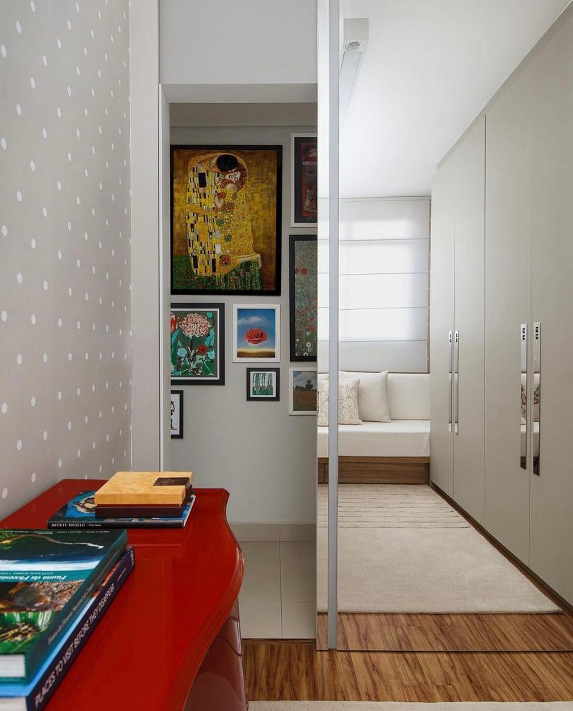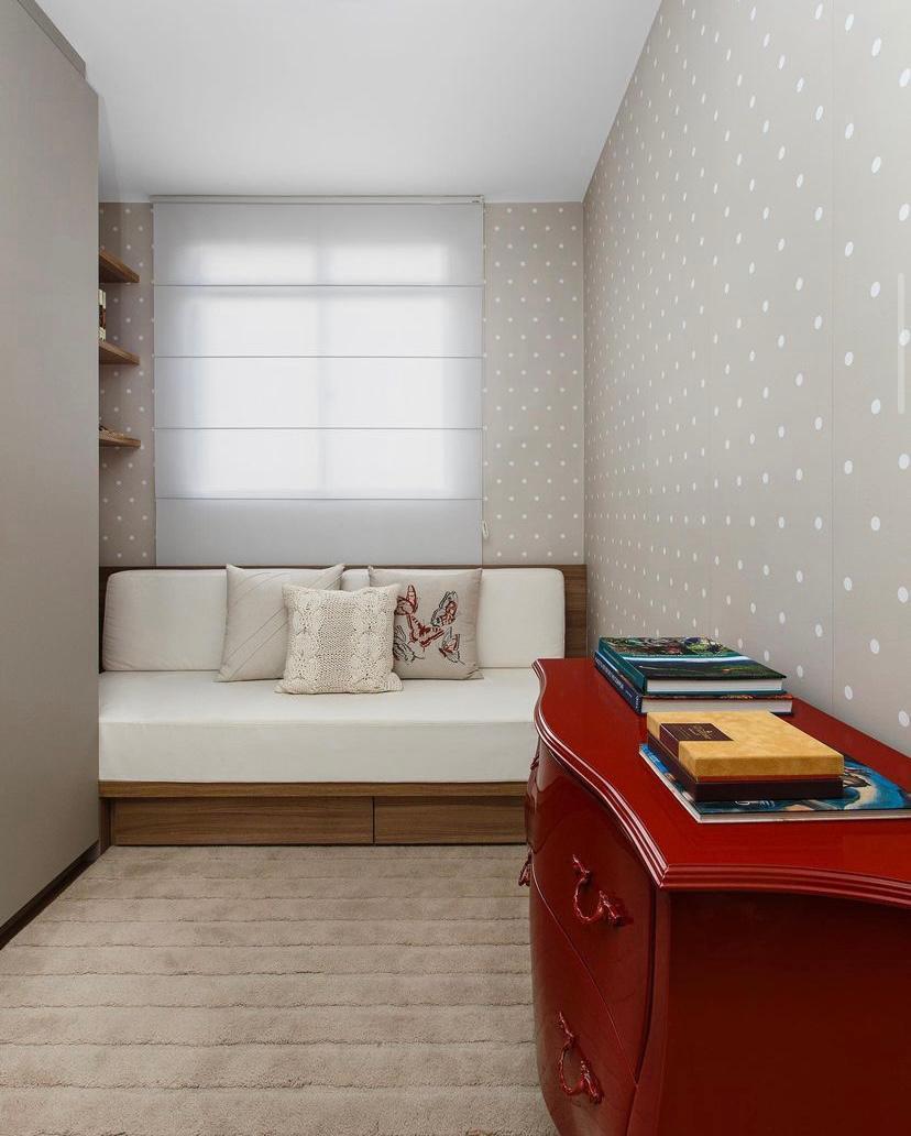 2 quartos com móveis planejados (guarda-roupa, painel para TV, cabeceira, sofá-cama, prateleiras e espelho);
