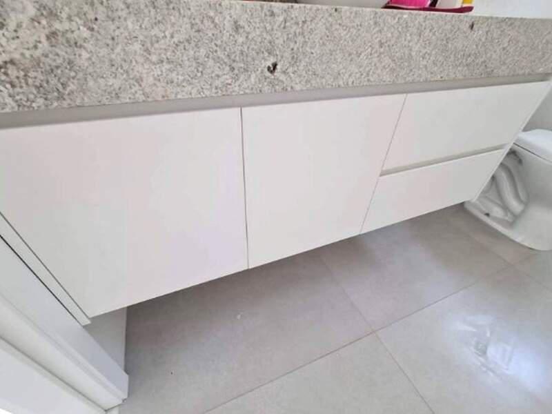 Banheiros com armários, piso em porcelanato, bancada em granito e box em blindex