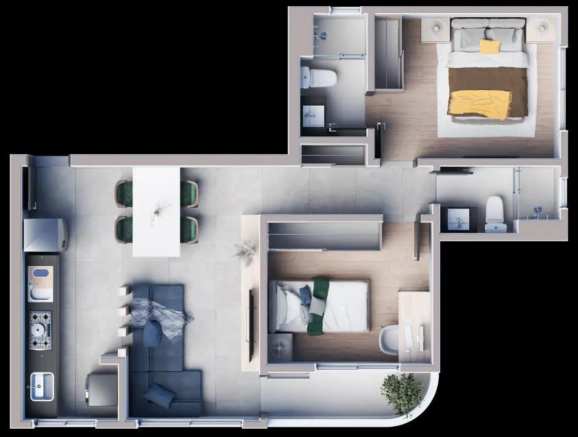 Apartamento com 55m² contando com dois quartos sendo uma suíte, banheiro social, sala de estar e jantar no mesmo ambiente, cozinha com área de serviço, varanda e duas vagas de garagem.