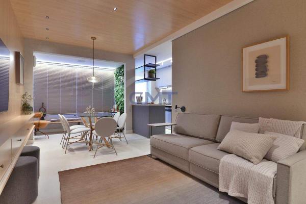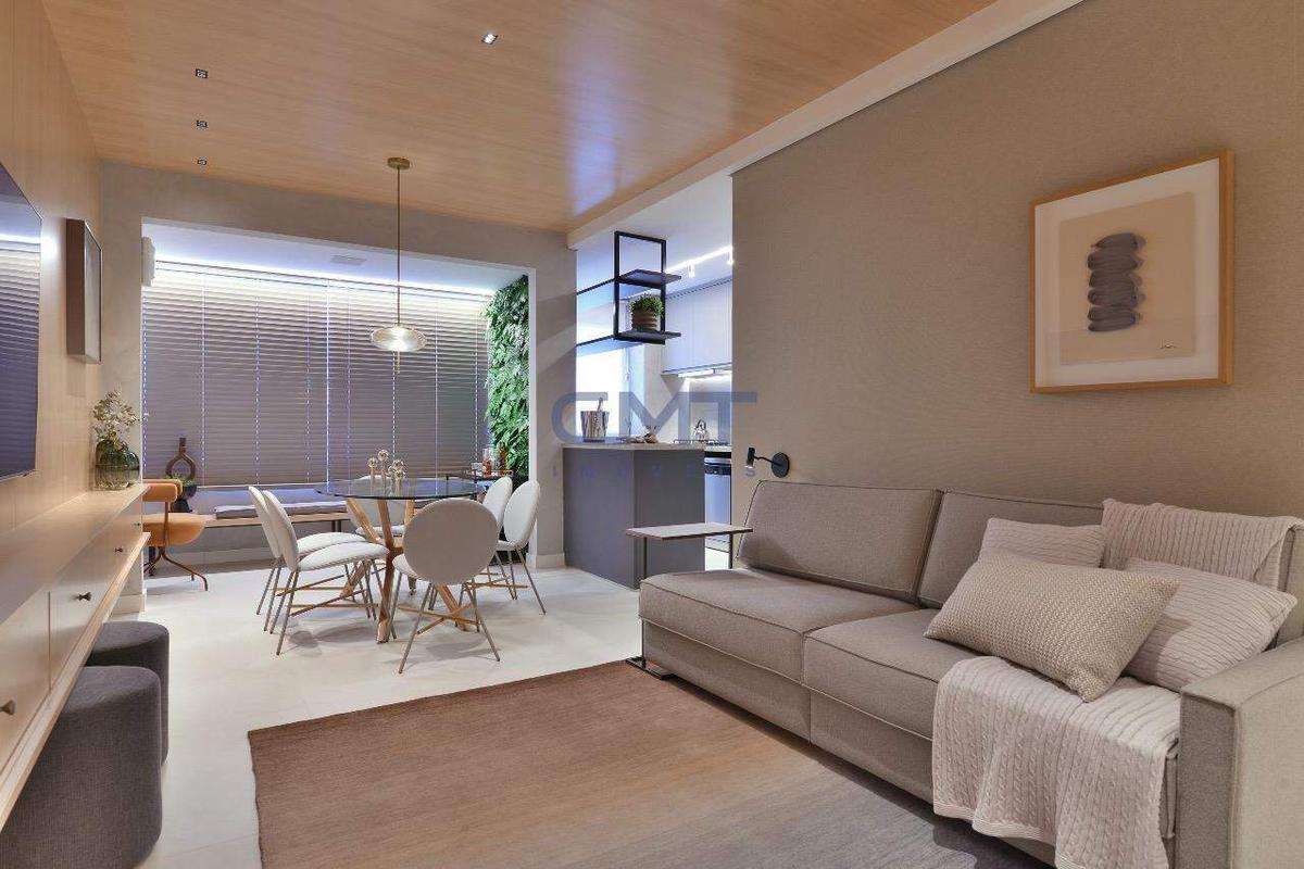 Sala para dois ambientes com piso em porcelanato, banho social, janelas em esquadria com persianas integradas e automatizadas, fechaduras digitais nas portas principais, borracha antirruído nas portas e varanda com acesso em esquadria de alumínio e vidro.