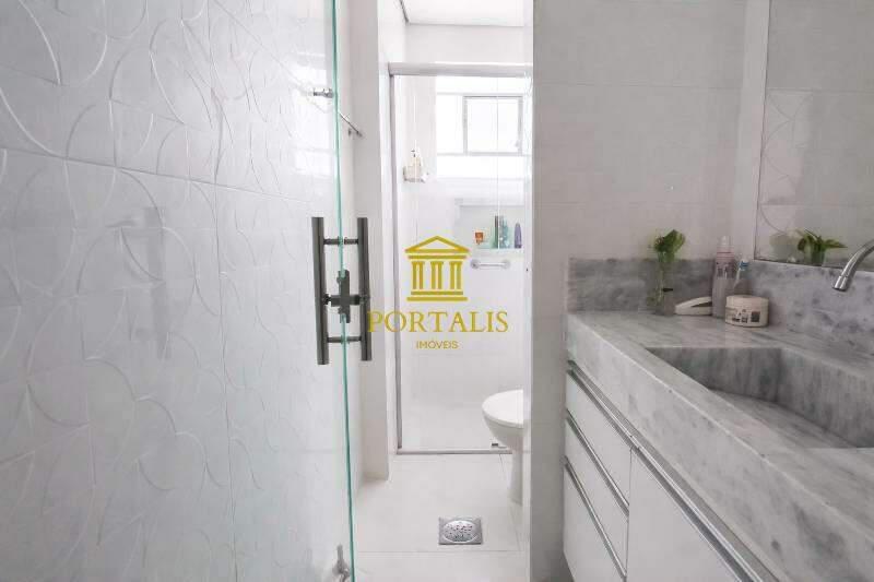 Banheiro social com bancada em granito, espelho, armários e box em blindex