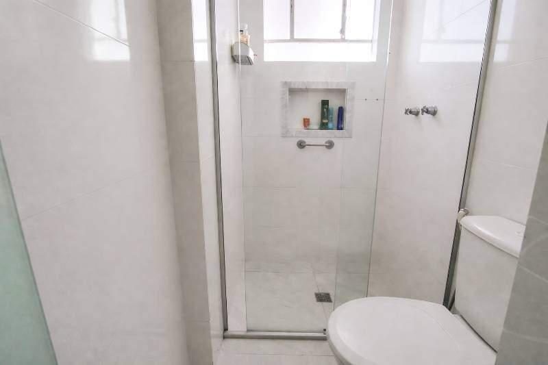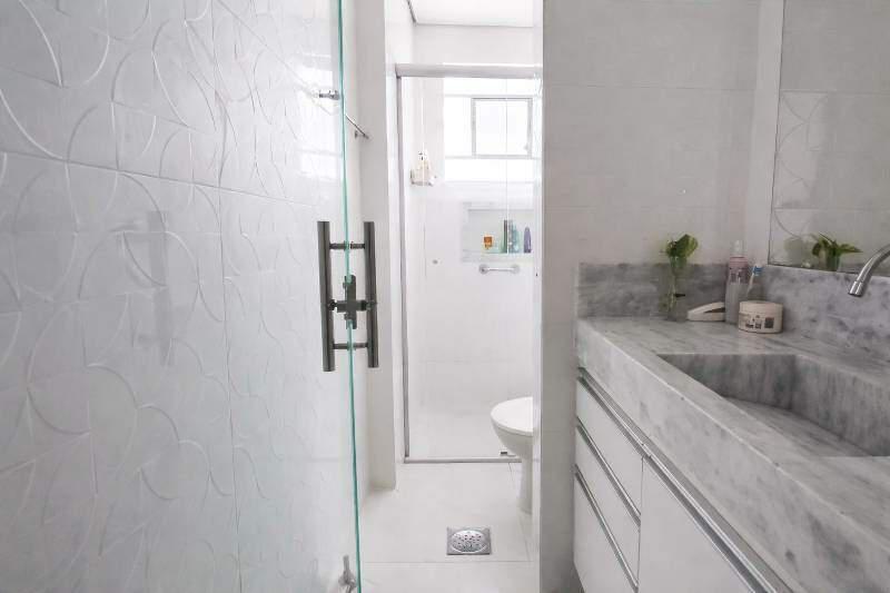 Banheiro social com bancada em granito, espelho, armários e box em blindex