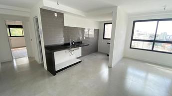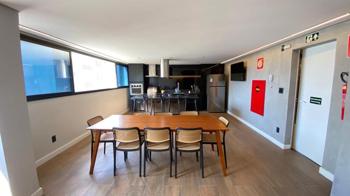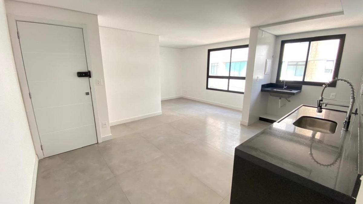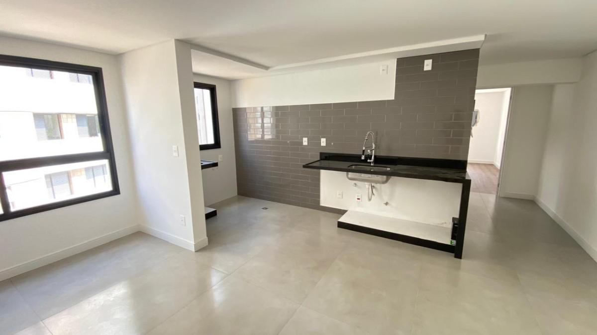 Cozinha conceito aberto, piso porcelanato, bancada em granito com armário.