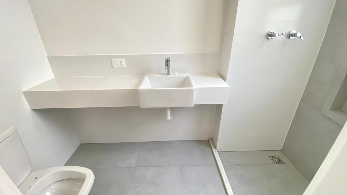 02 banhos (02 suítes), pisos e bancadas em porcelanato com armários, box com vidro temperado, chuveiro.