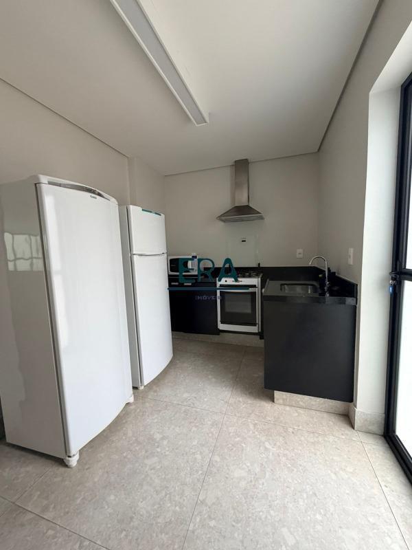 A cozinha é totalmente equipada, com armários planejados, cooktop, forno e geladeira, além de área de serviço funcional, também com marcenaria sob medida.