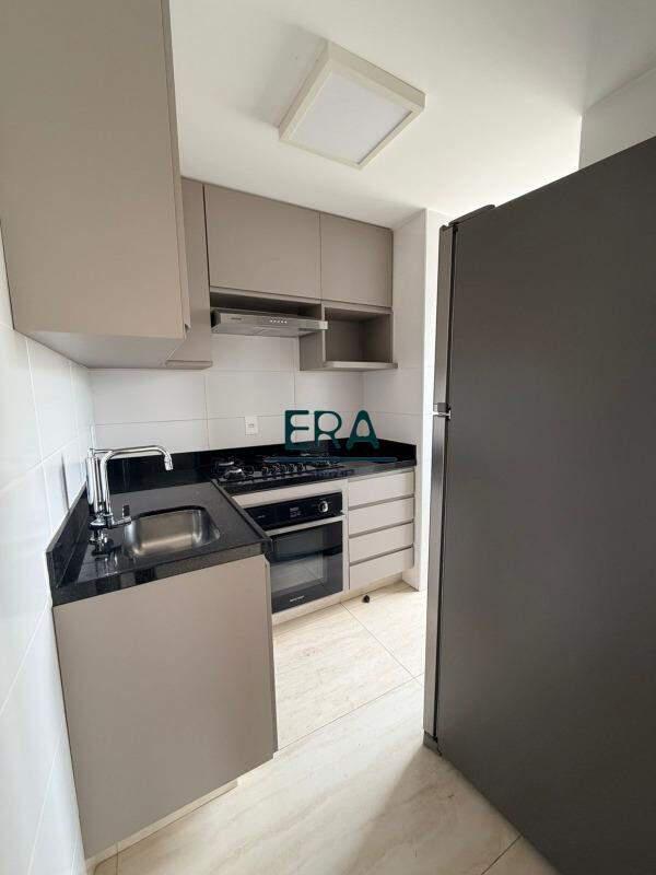 A cozinha é totalmente equipada, com armários planejados, cooktop, forno e geladeira, além de área de serviço funcional, também com marcenaria sob medida.